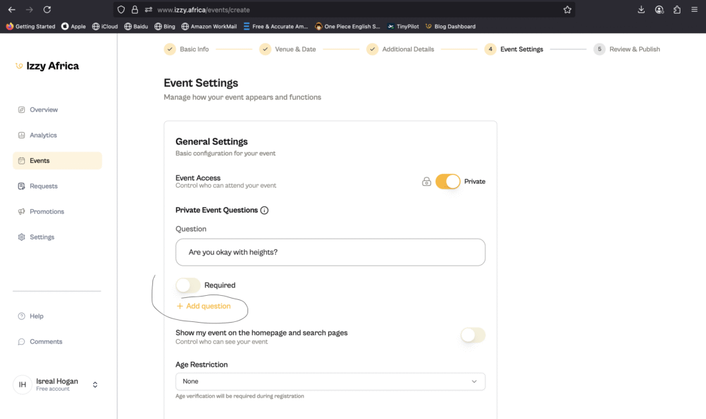 Once you switch it on, there will be an option to add event questions; these questions are optional by defauult but you can set them to be required, this way your users will have to answer the required questions before being able to register for your event.
