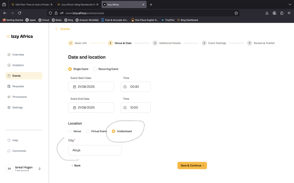After signup and sign-in, there’s a button that says “Create an Event” on the Overview page, click it and proceed to filll in the details about your event. As earllier mentioned, you can use the undisclosed option in the location field to hide your event location temporarily but still reveal the city where it will be happening.